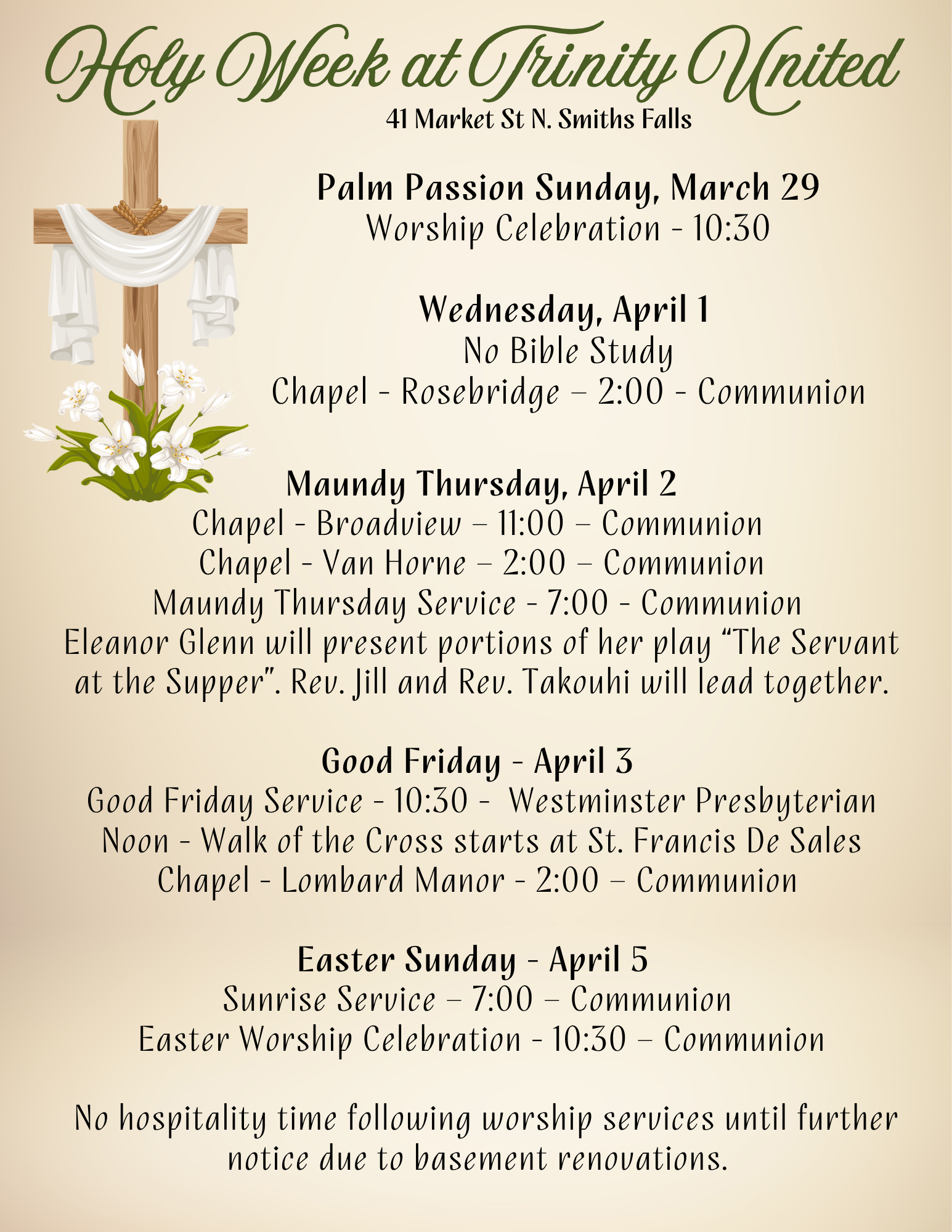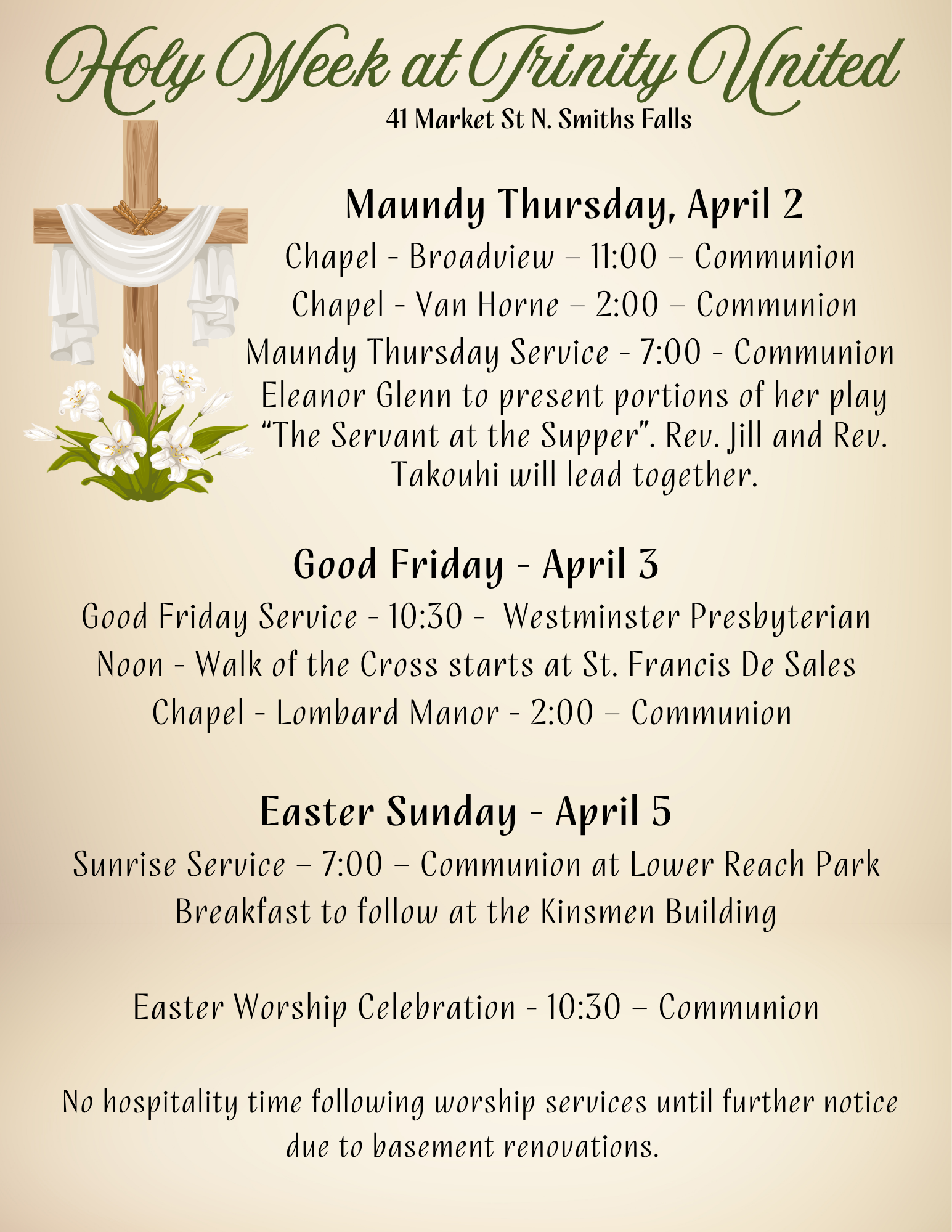 “Smiths Falls Trinity United Church is a Christian community that explores and shares its faith in open minded dialogue. Living out the love of God and the teachings of Jesus Christ. To grow spiritually to connect, inspire and serve the community and beyond.”